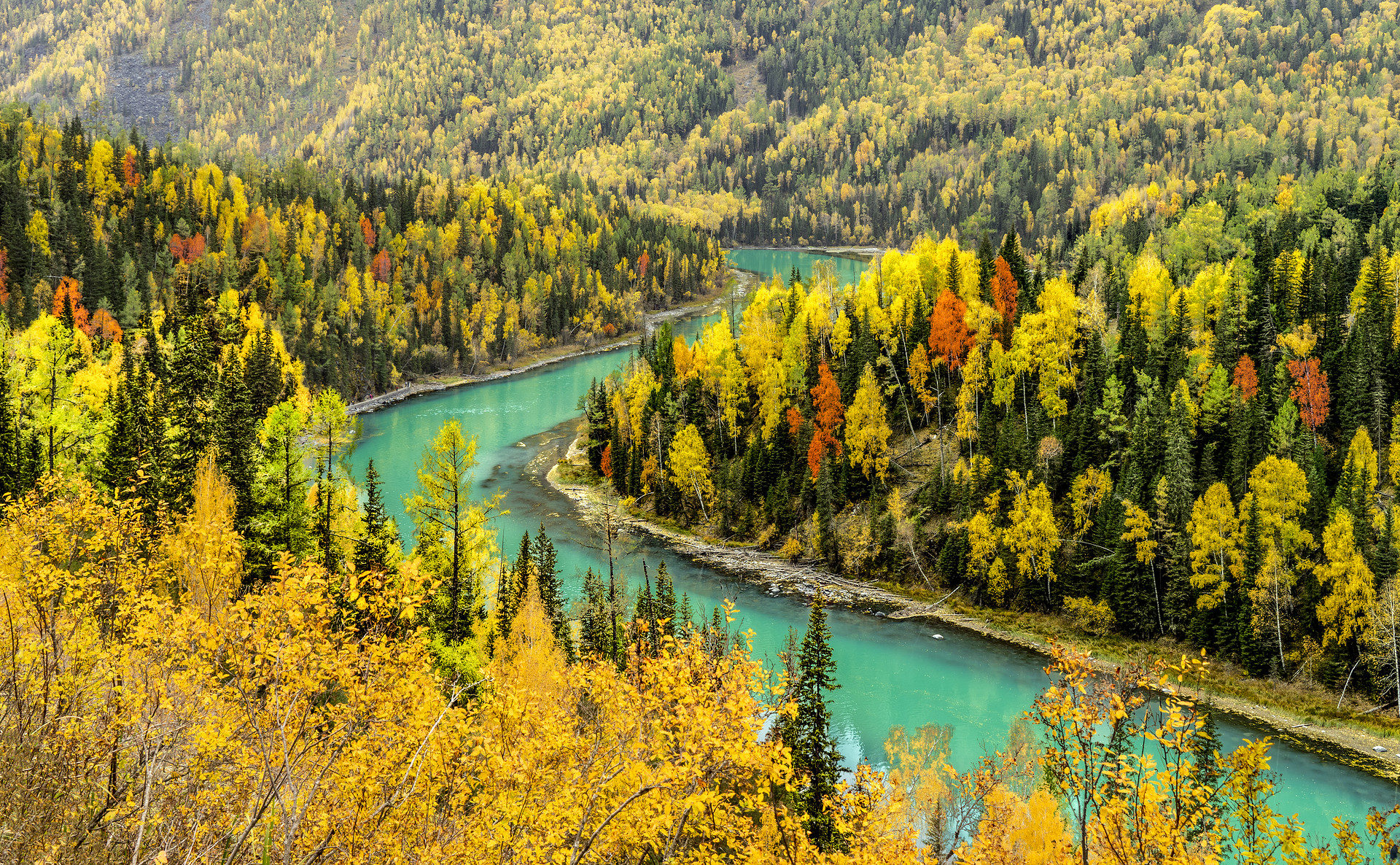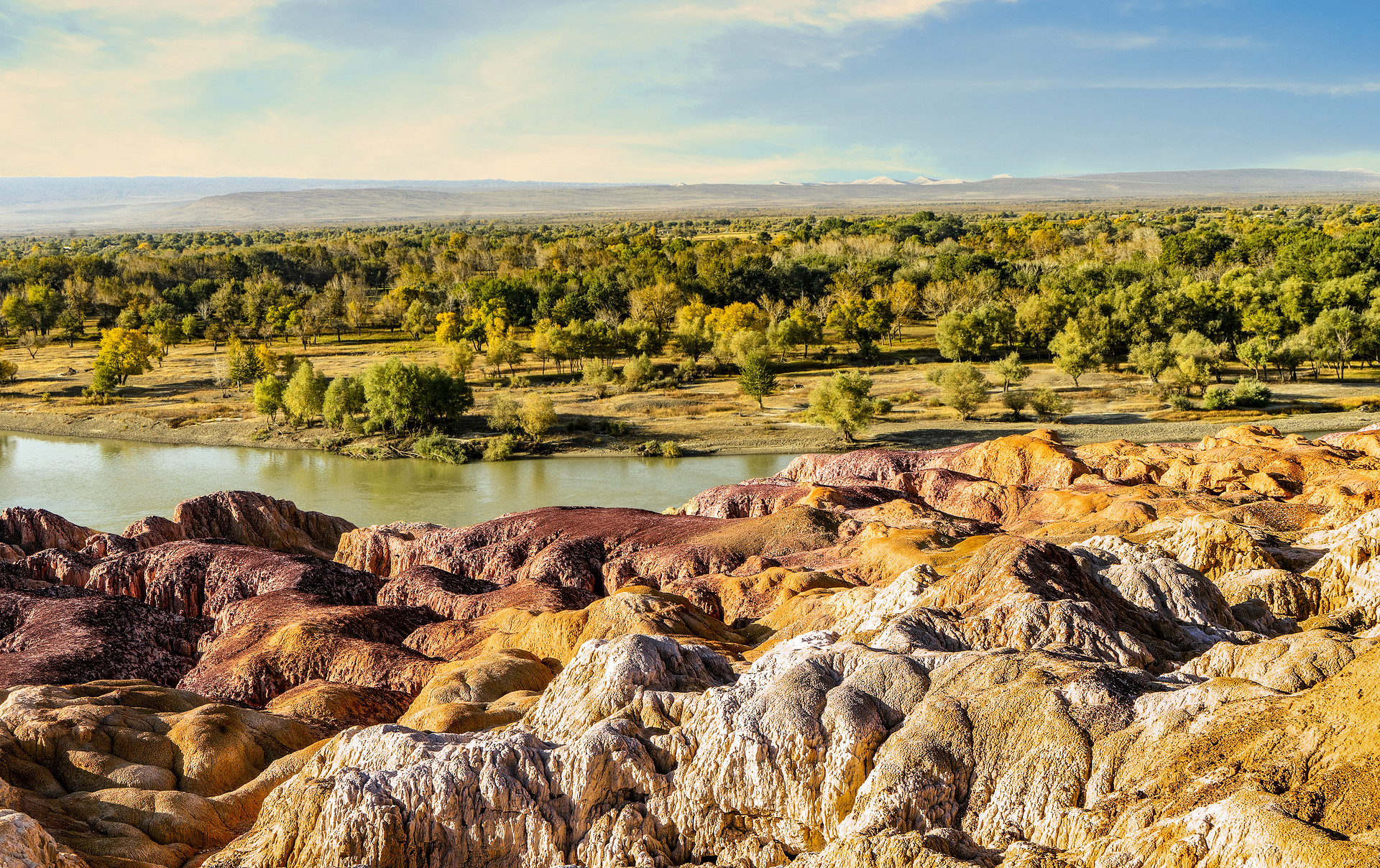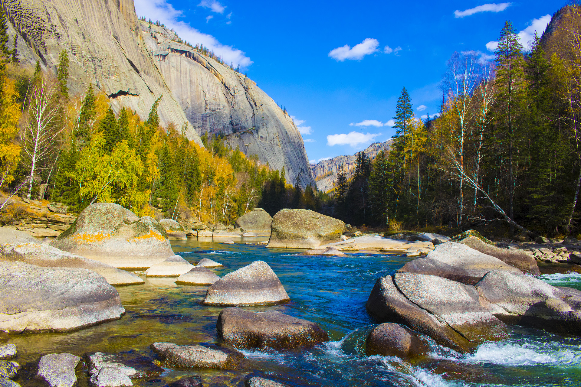 后游览【五彩滩】(游览约1小时),五彩滩一河两岸,南北各异,是国家4A级景区,注入北冰洋的河流――额尔齐斯河穿其而过。额尔齐斯河静静地流淌,金秋时节,河畔的白桦林镶金烁银,让人流连忘返。