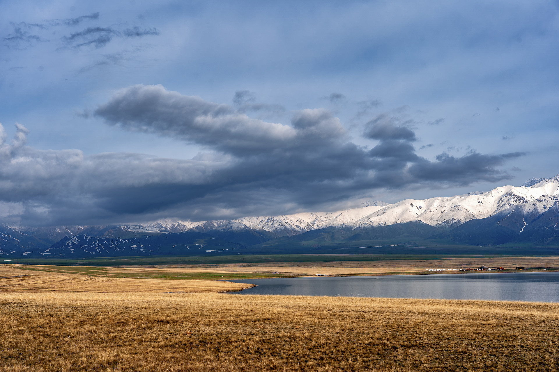 抵达【赛里木湖】。它是新疆海拔最高、面积最大、风光秀丽的高山湖泊,又是大西洋暖湿气流最后眷顾的地方,湖面海拔2071米,东西长30公里,南北宽25公里,面积453平方公里,蓄水量达210亿立方米,湖水清澈透底,透明度达12米,此时的赛里木湖还是一个半融化的冰湖,两边云杉和冷杉直入云霄,远处雪山连绵,蔚为壮观。